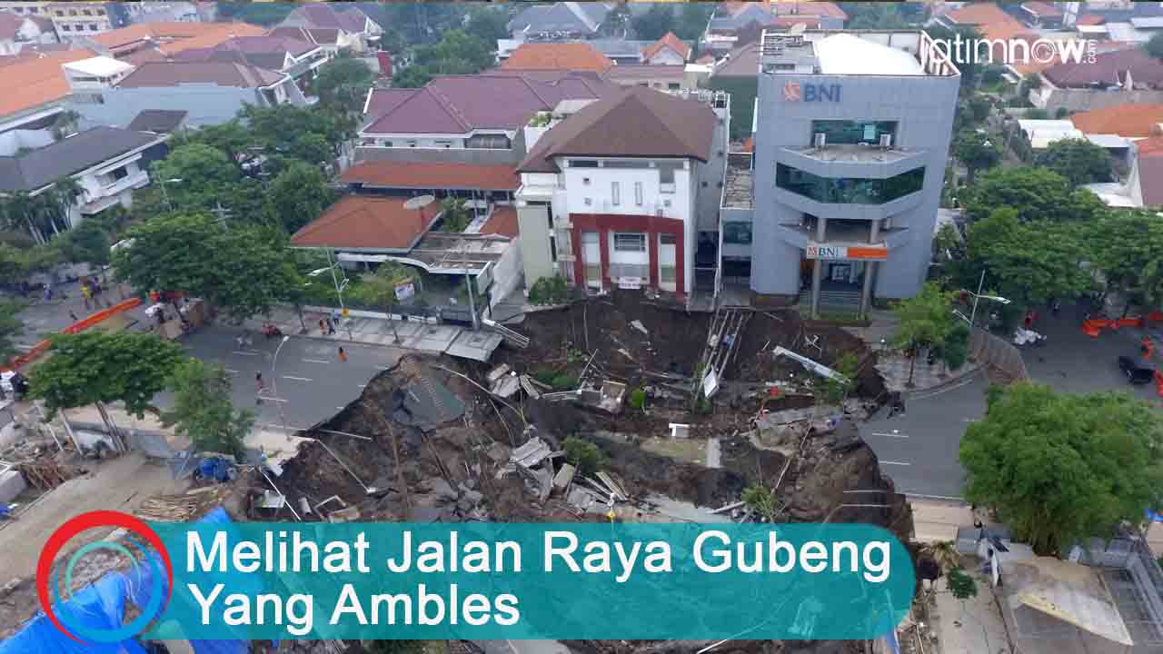 jatimnow.com - Area Jalan Raya Gubeng di Surabaya yang ambles cukup luas. Tidak hanya badan jalan aspal, namun juga halaman sebuah toko tas hingga lokasi proyek RS Siloam.