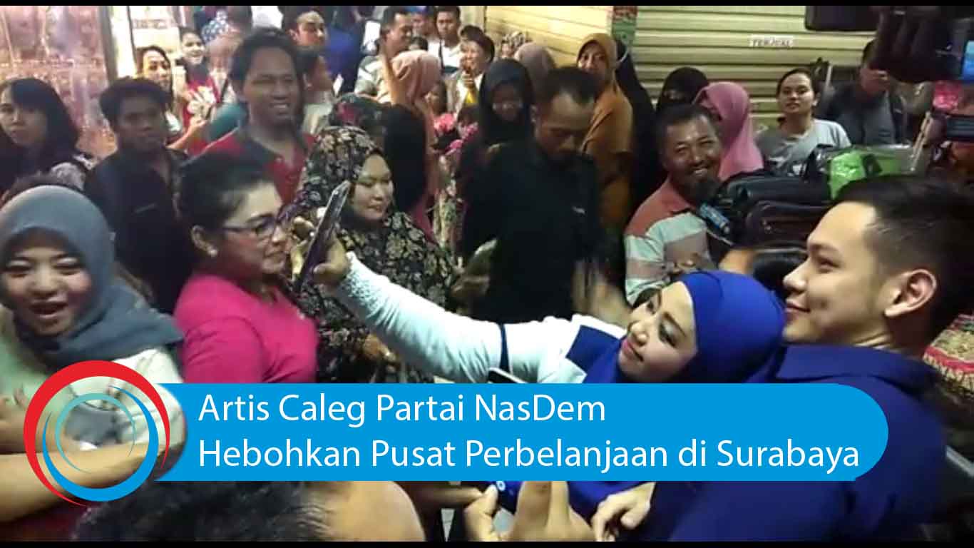 jatimnow.com - Kedatangan puluhan artis calon legislatif (caleg) Partai NasDem membuat heboh pengunjung pusat perbelanjaan di Surabaya. Artis caleg Nasdem mengunjungi Pusat Grosir Surabaya dan Tunjungan Plaza, Minggu (23/12/2018).