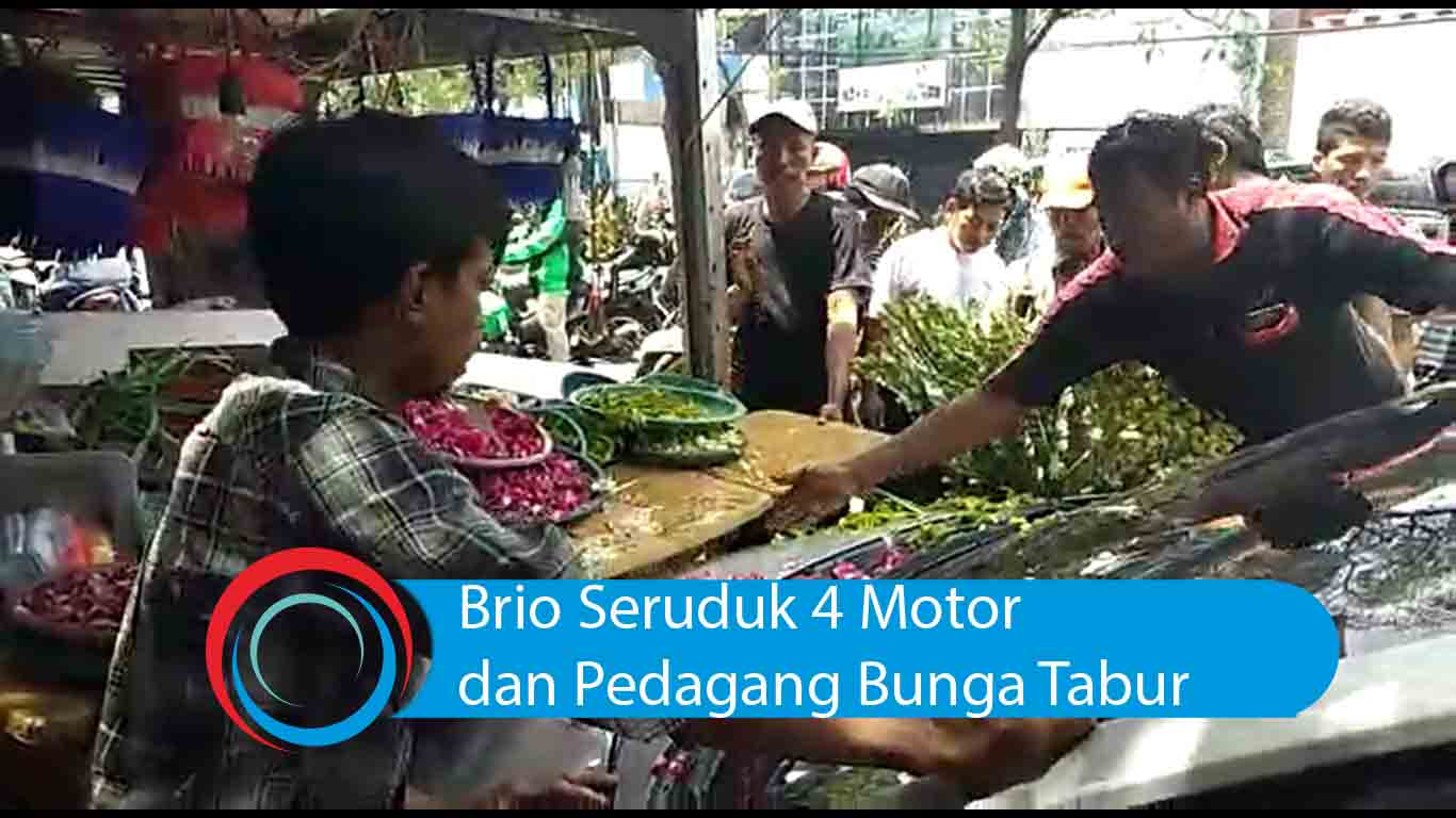 jatimnow.com - Kecelakaan terjadi di Jalan Kedungdoro, Surabaya (Minggu/13/01/2019). Mobil Honda Brio menabrak empat motor yang diparkir di depan warung kopi dan mobil pedagang bunga tabur.