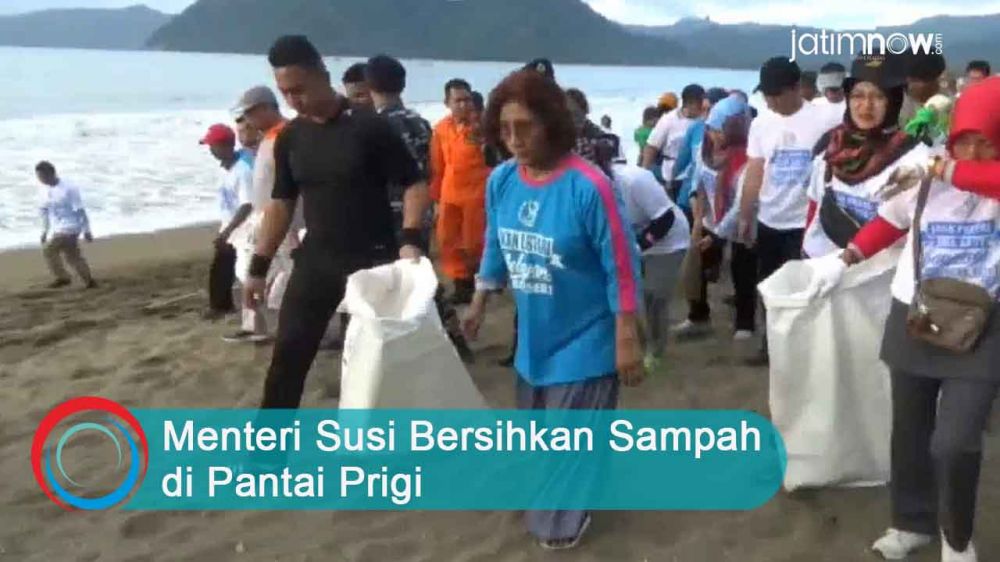 jatimnow.com - Menteri Kelautan dan Perikanan, Susi Pudjiastuti ikut serta dalam kegiatan bersih-bersih sampah di Pantai Prigi Kabupaten Trenggalek, Selasa (5/2/2019).