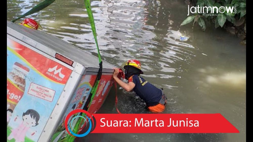 jatimnow.com - Motor roda tiga Tossa bernopol L 9943 AG terjun ke sungai yang berada di Jalan Petojo samping RS. Husada Hutama, Kelurahan Pacar Keling, Kecamatan Tambaksari, Surabaya, Rabu (6/2/2019).