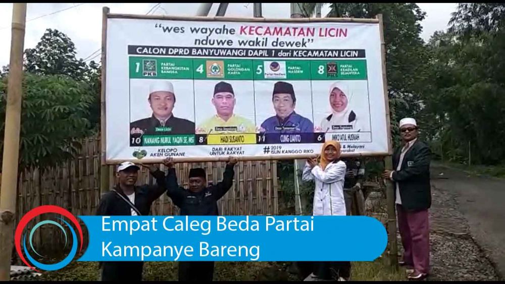 jatimnow.com - Empat caleg beda partai di Kecamatan Licin Banyuwangi, melakukan kampanye bareng, Jumat (8/2/2019). Keempat caleg itu berasal dari Partai Golkar, PKB, NasDem dan PKS.