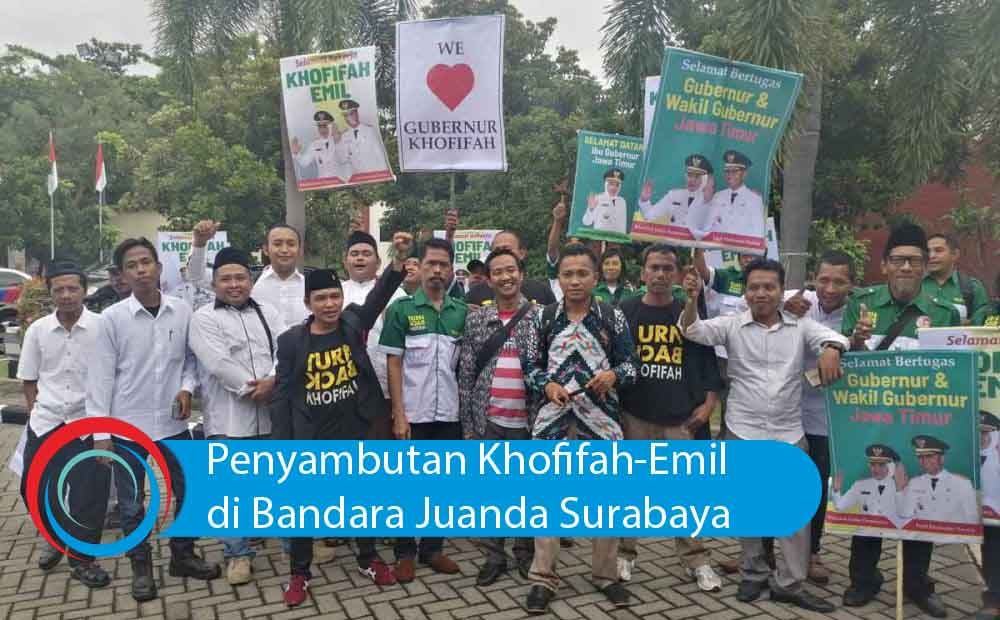 Para pendukung bersiap menyambut Khofifah-Emil yang bertolak dari Jakarta usai dilantik Presiden Joko Widodo, Rabu (13/2/2019) kemarin.