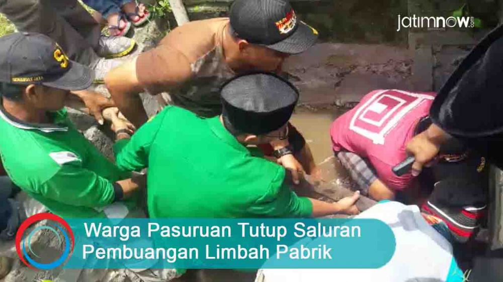 jatimnow.com - Warga Desa Wonokoyo, Gunung Gangsir dan Cangkringmalang serta Ansor PC NU Bangil, Pasuruan, Kamis (21/2/2019), melakukan aksi menutup saluran pembuangan limbah perusahaan yang selama ini berdampak langsung ke warga.