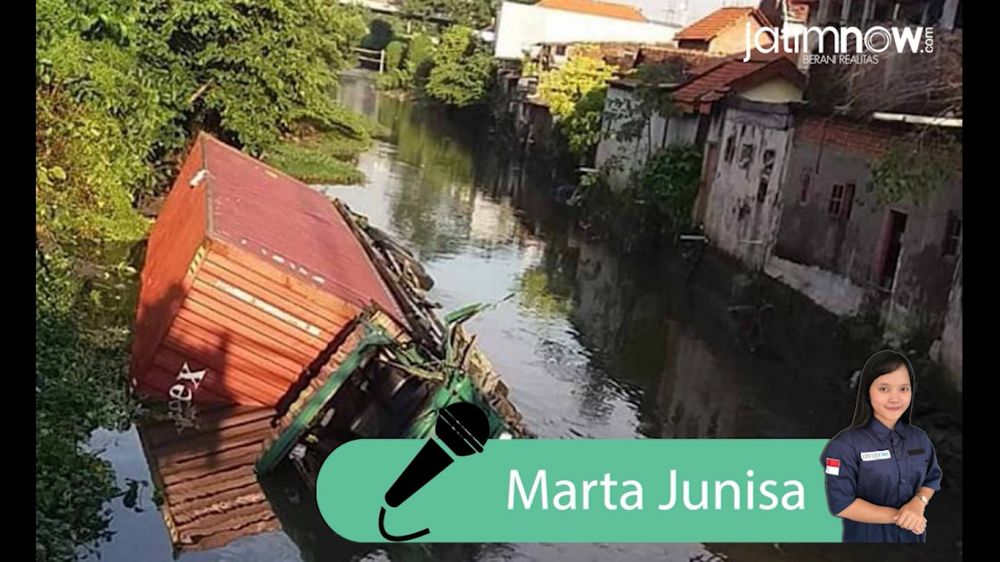 jatimnow.com - Kecelakaan terjadi di Taman, Sidoarjo, tepatnya di sebelah timur Tol Ketegan, Kamis (28/2/2019). Sebuah truk trailer bermuatan triplek nyemplung ke sungai di wilayah setempat.
