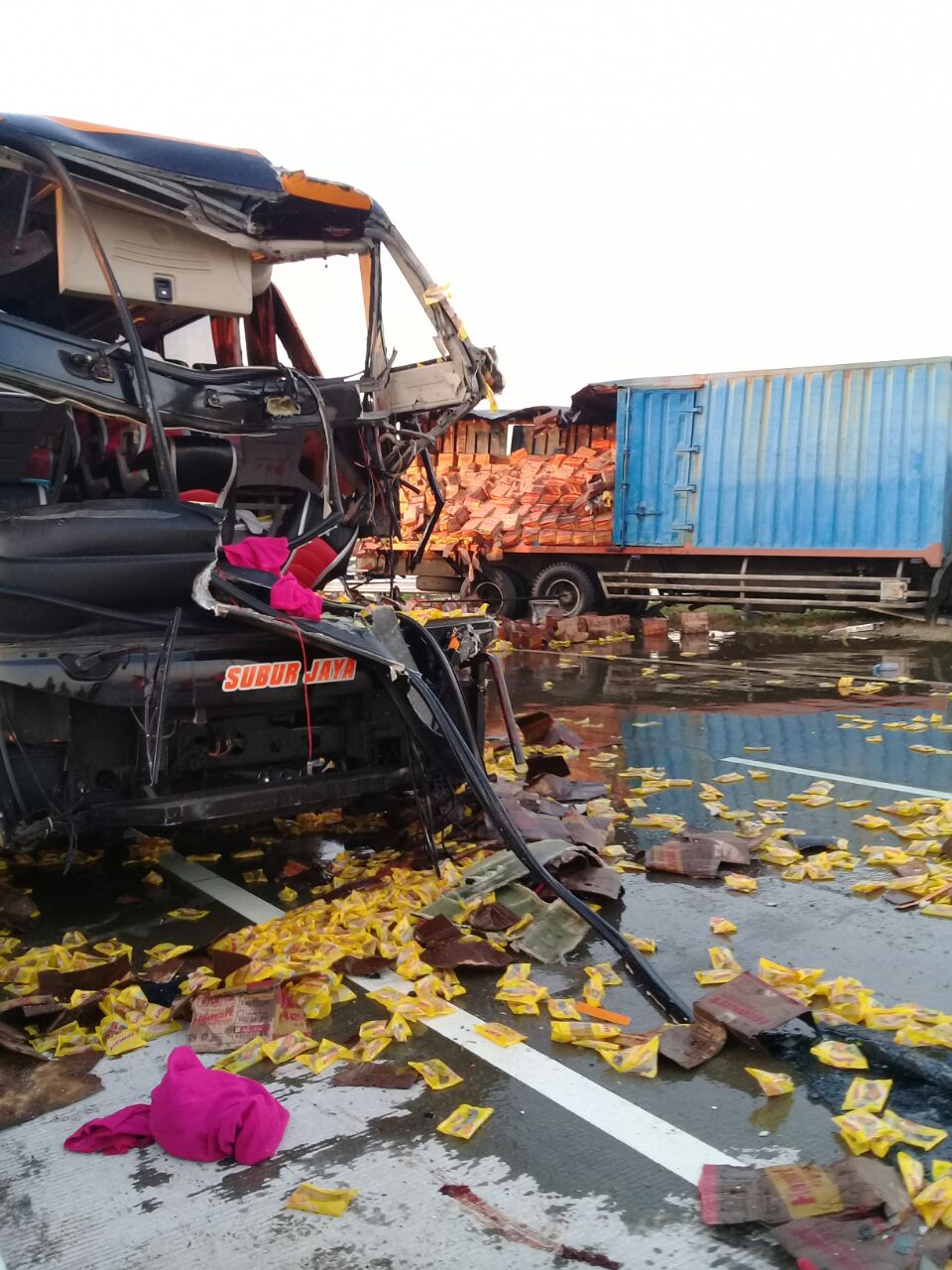jatimnow.com - Dalam kecelakaan itu satu korban meninggal 6 orang menderita luka-luka ringan. Sampai sekarang proses evakuasi bus dan truk masih berlangsung.