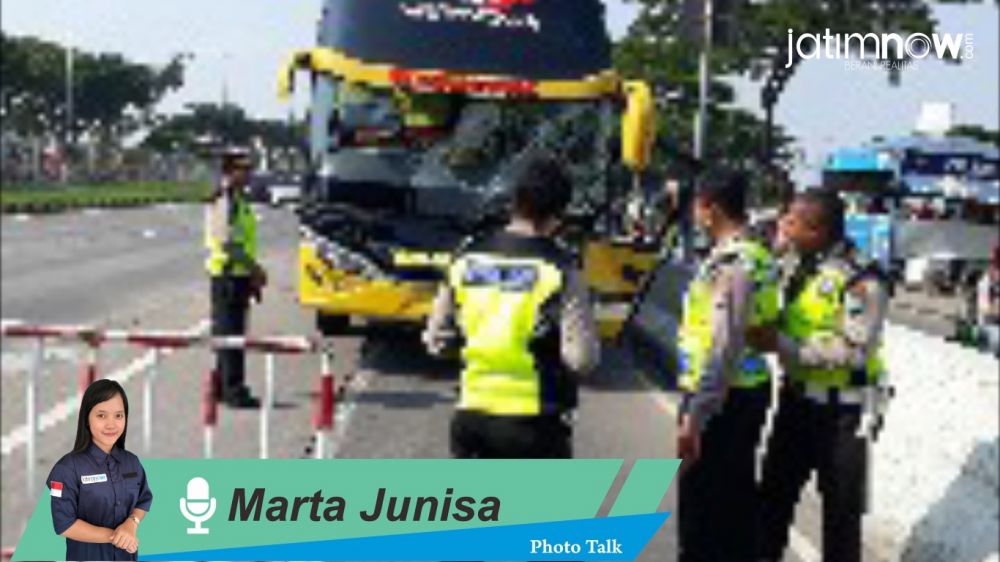 Kecelakaan itu terjadi sekitar pukul 08.00 Wib dan mengakibatkan kaca depan sebelah kiri bus pecah serta kernet bus yang bernama Jony, warga Dusun Salam, Suko, Sidoarjo, mengalami luka ringan.