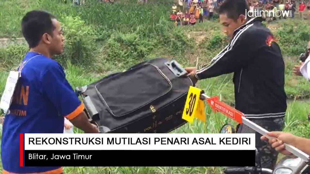 jatimnow.com - Aris Sugianto (34) dan Azis Prakoso (23), dua pelaku pembunuhan dan mutilasi penari asal Kediri memperagakan adegan pembuangan mayat dalam koper di Blitar, Rabu (24/4/2019). Polisi menggelar rekonstruksi di dua lokasi di Blitar.