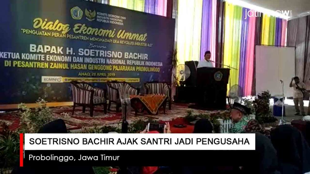 jatimnow.com - Ketua Komite Ekonomi dan Industri Nasional (KEIN) Republik Indonesia, Soetrisno Bachir, mengajak santri Pondok Pesantren Zainul Hasan Genggong Kecamatan Pajarakan, Kabupaten Probolinggo, menjadi pengusaha atau entreprenuer hadapi revolusi industri 4.0, Minggu (28/4/2019).