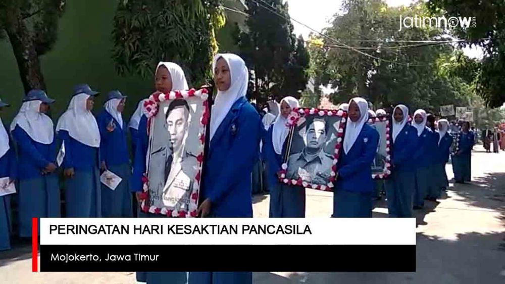 jatimnow.com - Siswa di Sekolah Menengah Atas Negeri (SMAN) 1 Bangsal memperingati Hari Kesaktian Pancasila secara berbeda. Upacara dipimpin oleh Dandim 0815 CPYJ Letkol Kav Hermawan Weharima.