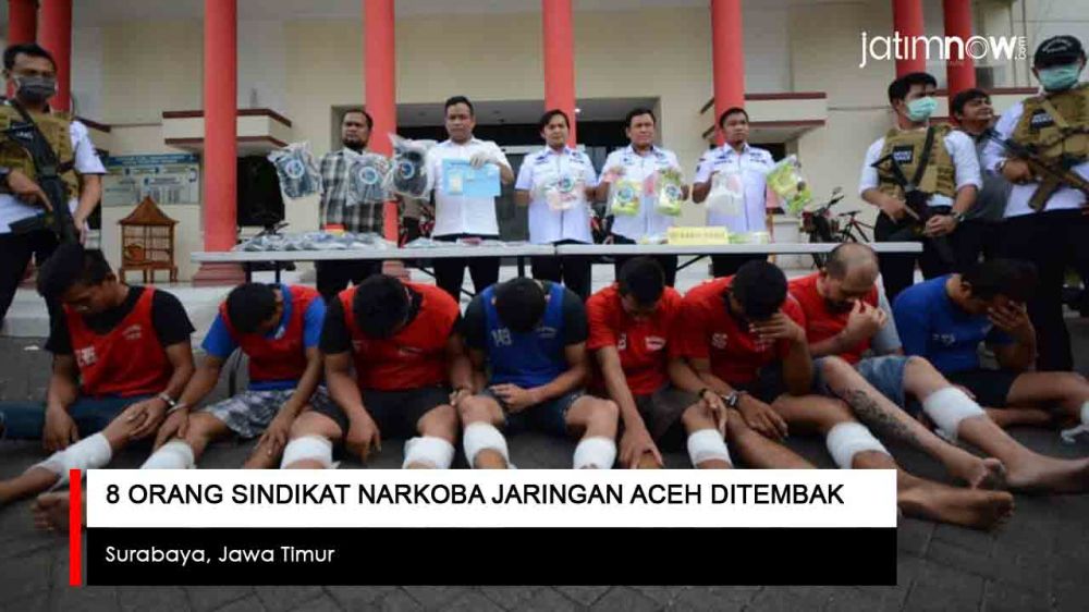 jatimnow.com - Tim Satresnarkoba Polrestabes Surabaya menangkap 8 tersangka yang diduga terkait peredaran narkoba jenis sabu-sabu jaringan Aceh.