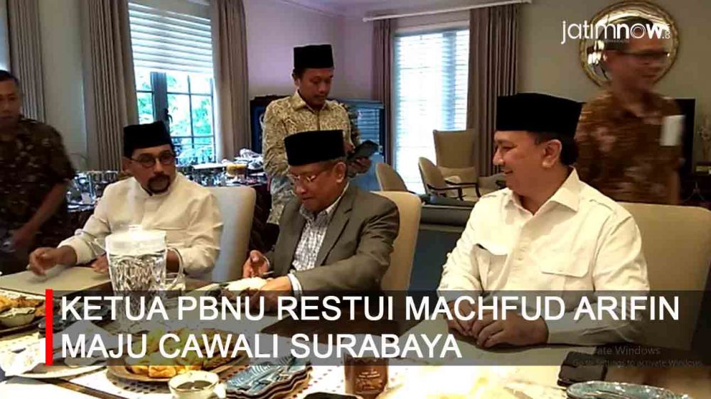 jatimnow.com - Ketua Umum (Ketum) Pengurus Besar Nahdlatul Ulama (PBNU) KH Said Aqiel Siradj memberikan doa dan restunya kepada mantan Kapolda Jatim Irjen Pol (Purn) Machfud Arifin yang maju sebagai calon wali kota Surabaya di Pilwali 2020.