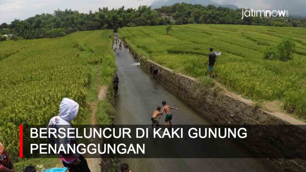jatimnow.com - Bermain seluncuran atau prosotan biasanya dilakukan anak-anak di tempat kering. Namun saluran air di areal persawahan Dusun Sudimoro, Desa Sampangagung, Kecamatan Kutorejo, Kabupaten Mojokerto, menjadi favorit anak-anak bermain seluncur air.