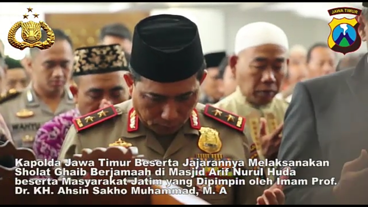 Jumat (11/5/2018) selepas Salat Jumat, ribuan jamaah meleburdi Masjid Arif Nurul Huda, Mapolda Jawa Timur. Mereka bersatu melaksanakan Salat Gaib untuk 5 polisi yang gugur dalam tugas tersebut. Ribuan jamaah ini, dipimpin oleh Imam, Prof Dr KH Ahsin Sakho Muhammad M.A.