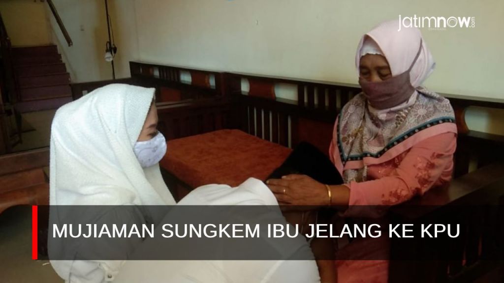 jatimnow.com - Jelang pendaftaran ke KPU Kota Surabaya, Bakal Calon Wakil Wali Kota Mujiaman Sukirno bersama istrinya Acstantia Haqyafandri sungkem kepada ibundanya yang bernama Musringah (71), Minggu (6/9/2020).