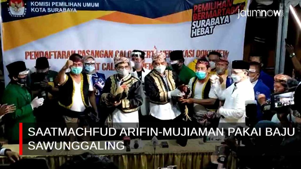 Setelah berkas pendaftaran dinyatakan diterima karena sudah lengkap, sejumlah sesepuh Kota Pahlawan menyematkan busana Sawunggaling dan ayam jago sebagai lambang pemimpin.