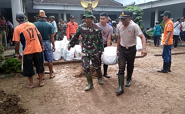 jatimnow.com - Anggota Kodim 0802 dan Polres Ponorogo kerja bakti membuat tanggul sementara di Sungai Sono, Desa Maguwan, Kecamatan Sambit, Kabupaten Ponorogo usai banjir lumpur, Senin (5/2/2018) pagi.