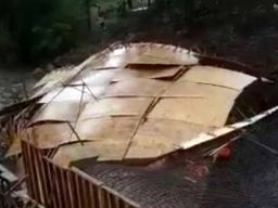 Video berdurasi 51 detik itu menunjukkan papan cor dan kayu penyangga jembatan itu hanyut.