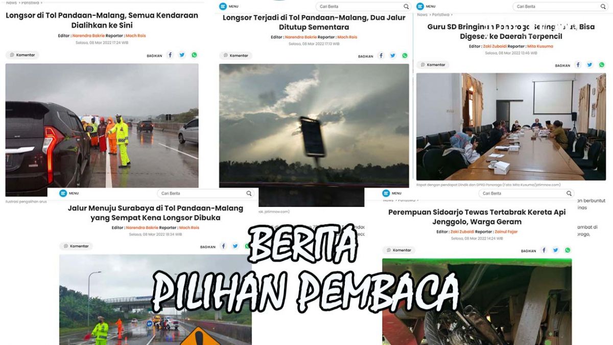 jatimnow.com - Pengalihan jalur di Tol Pandaan-Malang akibat longsor berada di urutan teratas pilihan pembaca pada Selasa (8/3/2022). Paling banyak dibaca kedua masih seputar penutupan jalur Tol Pandaan-Pasuruan. Lalu ada berita guru SD Bringinan Ponorogo sering telat.