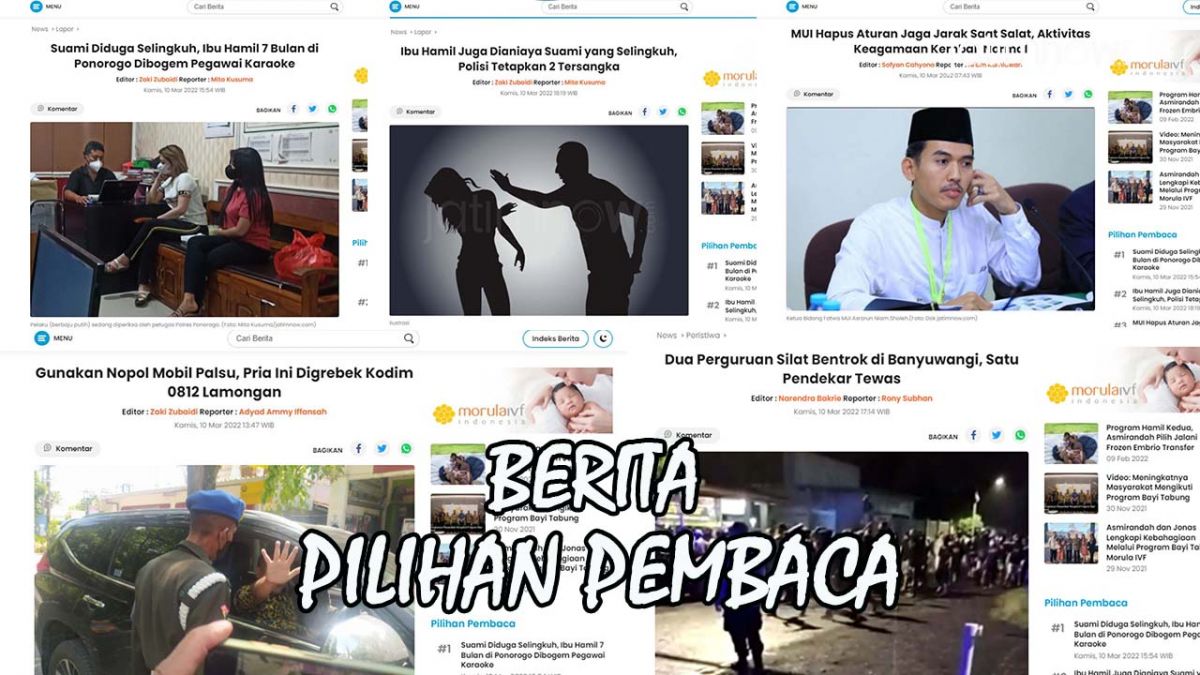 jatimnow.com - Ibu hamil 7 bulan dibogem pegawai karaoke menjadi berita paling banyak dibaca pada Kamis (10/3/2022). Di posisi kedua pilihan pembaca masih seputar berita yang sama. Yakni berjudul, Ibu Hamil Juga Dianiaya Suami yang Selingkuh, Polisi Tetapkan 2 Tersangka. Kemudian ada berita MUI hapus aturan jaga jarak saat salat.