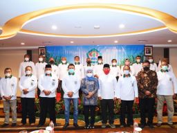 Surabaya - Gubernur Jawa Timur Khofifah Indar Parawansa menghadiri pengukuhan Dewan Pembina dan Pengurus Asosiasi Petani Tebu Rakyat Indonesia (APTRI) masa bakti 2022-2027. Acara berlangsung di Hotel Best Western Papilio, Surabaya, Sabtu (19/3/2022).