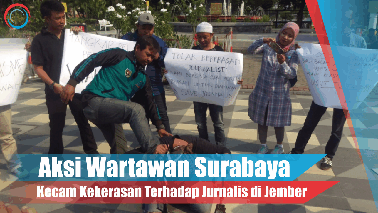 jatimnow.com - Puluhan wartawan Surabaya menggelar aksi solidaritas insiden kekerasan yang menimpa seorang wartawan online, Oryza A. Wirawan, saat meliput pertandingan Persid Jember vs Dharaka Sindo di Stadion Jember Sport Garden.
