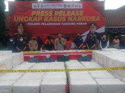 Polres Pelabuhan Tanjung Perak Surabaya saat merilis kasus narkoba jaringan internasional yang diungkap dari daerah Dawarblandong, Mojokerto.(Foto: Zain Ahmad/jatimnow.com)