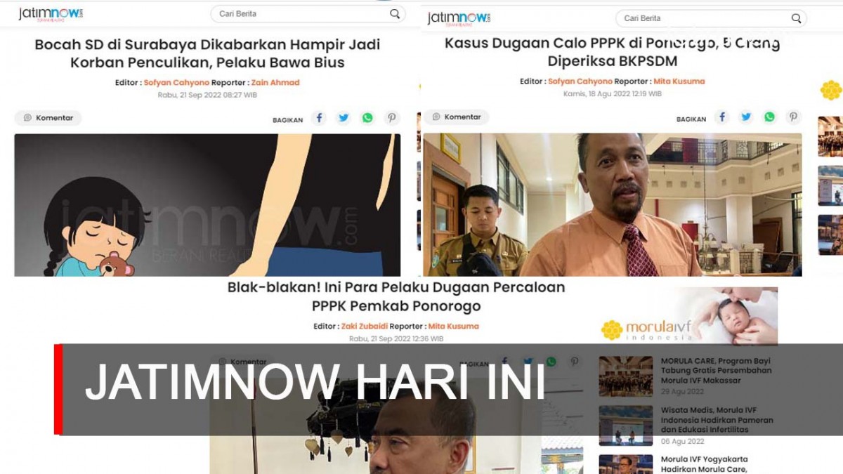 jatimnow.com - Bocah SD di Surabaya dikabarkan hampir jadi korban penculikan hingga Bupati Ponorogo bakal umumkan terduga calo PPPK dan sanksinya menjadi rangkuman jatimnow tv hari ini, Rabu (21/9/2022).