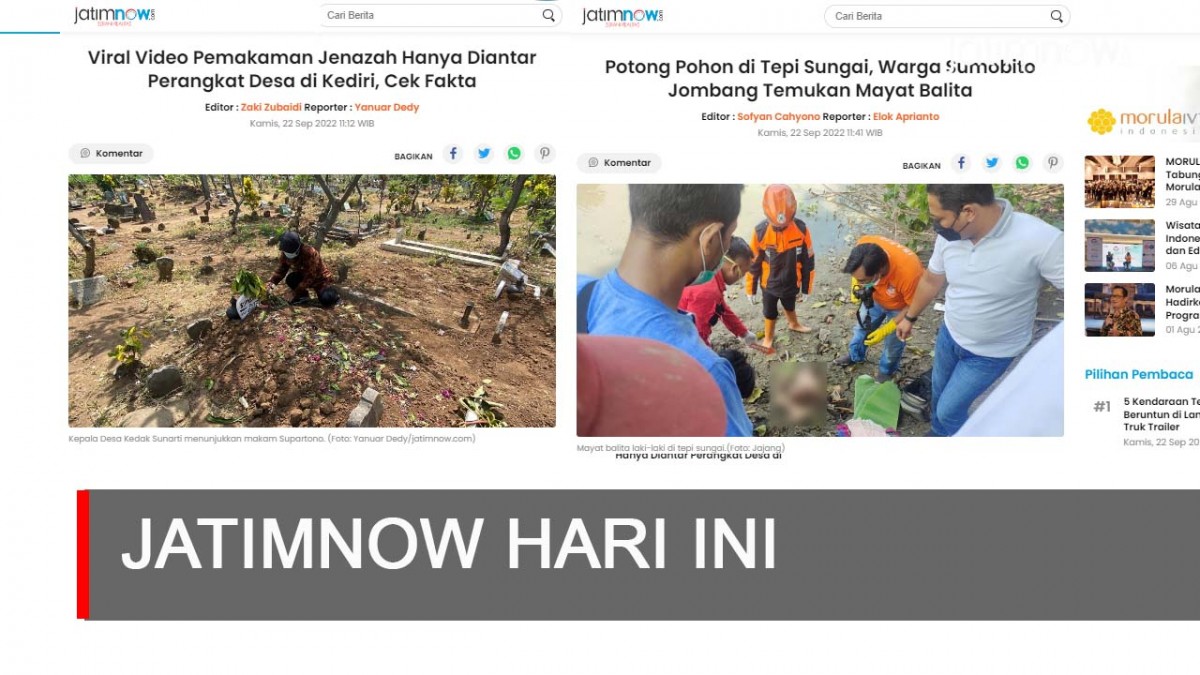 jatimnow.com - Viral video pemakaman jenazah hanya diantar perangkat desa di Kediri hingga potong pohon di tepi sungai, warga Sumobito Jombang temukan mayat Balita, inilah jatimnow tv hari ini, Kamis (22/9/2022).