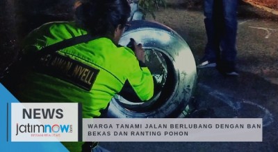 Respon Pemerintah Kabupaten (Pemkab) Sidoarjo dinilai lamban, warga Desa Kletek, Kecamatan Taman, Kabupaten Sidoarjo nekad tanami jalan berlubang dengan ban bekas dan ranting pohon.