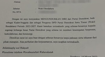Surat pengunduran diri Wakil bendahara Partai Demokrat Jatim, Sugiharto. (foto: Abdul Haris Siregar for jatimnow.com)