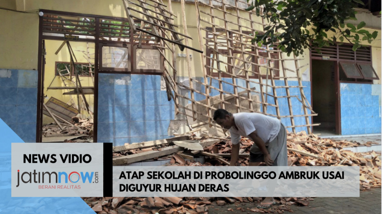 jatimnow.com - Hujan lebat disertai angin kencang merobohkan atap sebuah sekolah Madrasah Ibtiadaiyah (MI) Islamiyah di Desa Sentul, Gading, Kabupaten Probolinggo, Kamis (7/3/2024).