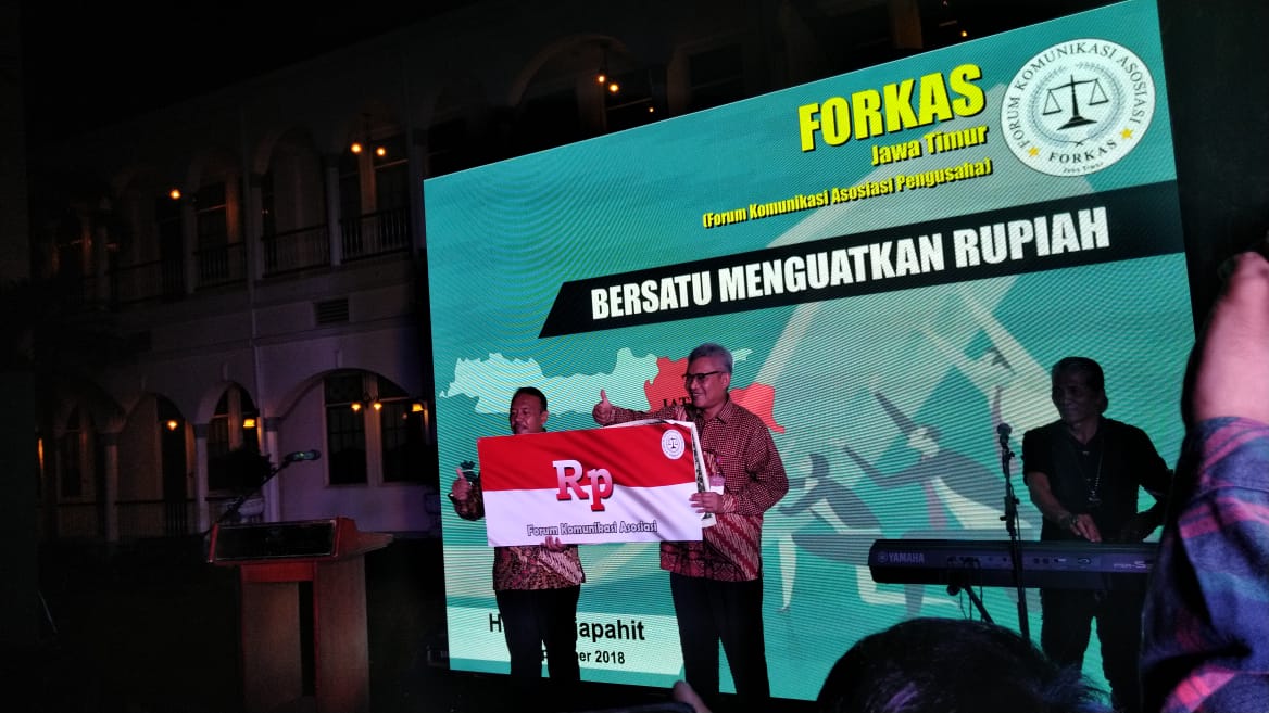 jatimnow.com - Para pengusaha yang tergabung dalam forum komunukasi asosiasi pengusaha Jawa Timur melakukan erakan melepas dollar Amerika Serikat di Surabaya, Kamis (20/9/2018). Hasilnya, 50 juta dollar AS yang ditukar diperkirakan mencapai sekitar Rp 700 milliar lebih.