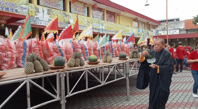 “Semua paket ini berasal dari sumbangan umat. Meraka yang datang ini ada yang dari Tulungagung sendiri, juga dari Kediri, Nganjuk, Trenggalek, dan daerah lain. Setelah prosesi sembahyang selesai, baru kita bagikan secara tertib sembakonya kepada masyarakat yang sudah datang,” tambah Wibitono.