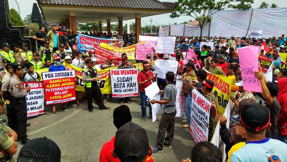 jatimnow.com - Protes mahalnya harga jagung sebagai pakan ternak, ribuan peternak ayam mendatangi Kantor Pemkab Blitar, Senin (15/10/2018). Mereka menggelar aksi demonstrasi menuntut Pemkab memperhatikan nasib peternak ayam.