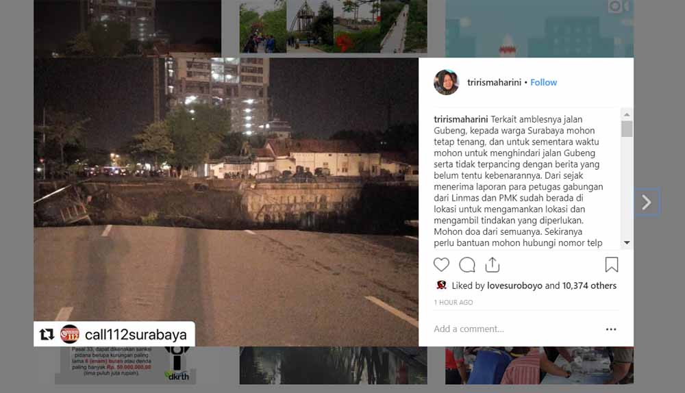 jatimnow.com - Wali Kota Tri Rismahrini melalui instagram meminta warga Surabaya tetap tenang dan tidak terpancing informasi yang belum tentu kebenarannya menyusul amblasnya Jalan Raya Gubeng, sekitar lokasi proyek perluasan RS Siloam.