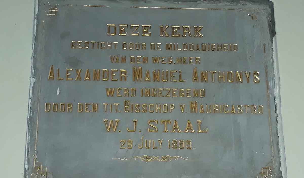 Ignatius menerjemahkan prasasti tersebut dan menerangkan jika pembangunan gereja itu berkat kedermawanan Alexander Manuel Antonys yang diberkati uskup kehormatan (Titular Bishop) dari Mauricastro W.J. Staal yang kemudian diresmikan pada 28 Juli 1895.