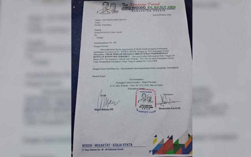Surat permintaan bantuan konsumsi yang mengatasnamakan TKD Gresik itu beredar di media sosial. Dalam surat tersebut, TKD Gresik disebut meminta bantuan konsumsi untuk acara kampanye dan deklarasi dukungan pada Senin (18/3/2019).