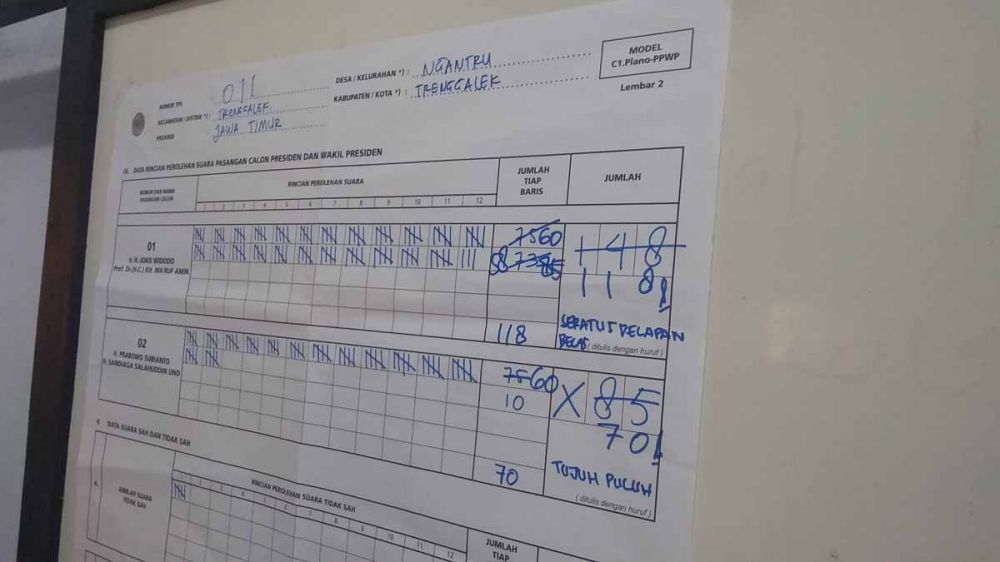 jatimnow.com - Pasangan Calon Presiden (Capres)-Calon Wakil Presiden (Cawapres) Nomor Urut 01, Joko Widodo (Jokowi)-KH Ma'ruf Amin menumbangkan pasangan calon Prabowo-Sandi di TPS 011, Kelurahan Ngantru, Kecamatan/Kabupaten Trenggalek.
