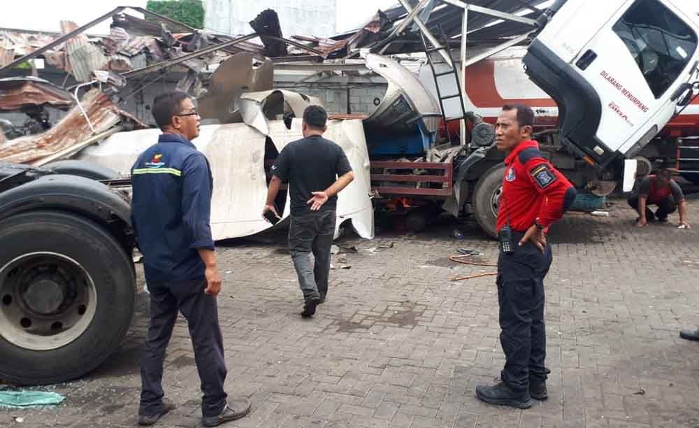 Sebuah tangki milik PT Surya Mitra Tirta Kencana bernopol L 9764 UL di Jalan Nambangan 116, Kelurahan Tanah Kali Kedinding, Kecamatan Kenjeran, Surabaya meledak, Senin (29/4/2019).