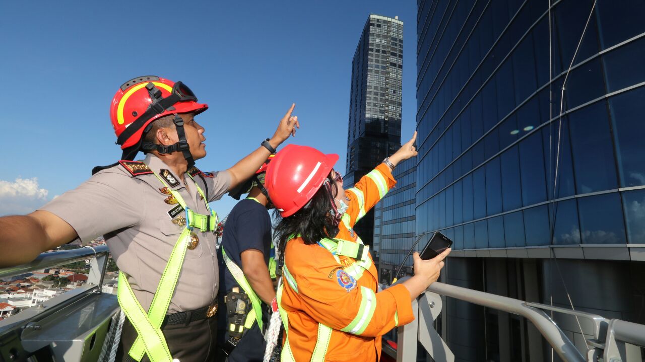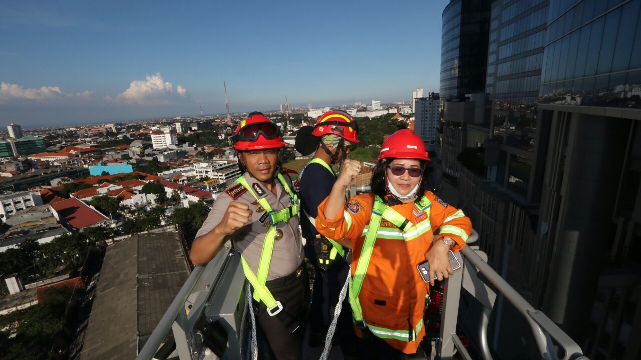 Kombes Pol Rudi Setiawan bersama Candra Oratmangun menumpang , mobil pemadam kebakaran terbaru milik Pemkot Surabaya yang diberi nama Bronto Sky Lift .