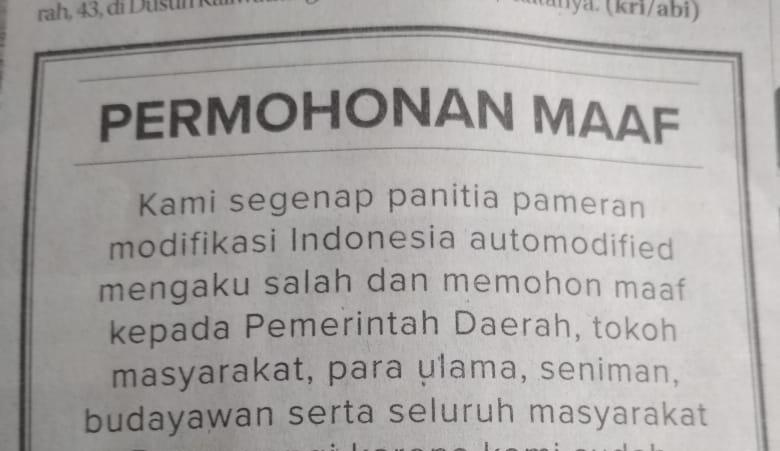 "Kami segenap panitia pameran modifikasi Indonesia Automodified mengaku salah dan memohon maaf kepada masyarakat daerah, tokoh masyarakat, para ulama, seniman, budayawan, serta seluruh masyarakat Banyuwangi karena kami sudah menyalahi izin yang dikeluarkan oleh Dinas Kebudayaan dan Pariwisata Kabupaten Banyuwangi dan kami sangat menyesal atas kejadian ini. Tertanda Panitia Pameran Modifikasi Indonesia Automodified," demikian isi iklan tersebut.