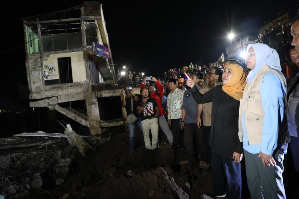 "Saya juga bersama tim sudah melakukan beberapa pembahasan soal Kali Jompo ini, karena posisi rukonya memang sudah berisiko tinggi hingga akhirnya saat intensitas hujan sebagian ruko ambruk ke sungai. Berbagai rekomendasi tim PUPR menunjukkan bahwa kita harus melakukan pembongkaran pada bangunan ruko di bantaran sungai yang tersisa sekaligus mengganti jembatan kali jompo," kata Khofifah usai peninjauan lokasi bencana.