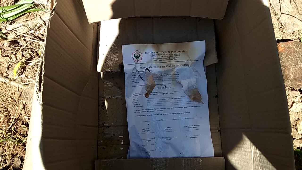 Sedangkan dari data yang dihimpun di lapangan, terdapat secarik kertas yang tertempel di dalam kardus dan tercantum logo Rumah Sakit Yasmin yang berada di Jalan Letkol Istiqlah, Banyuwangi.