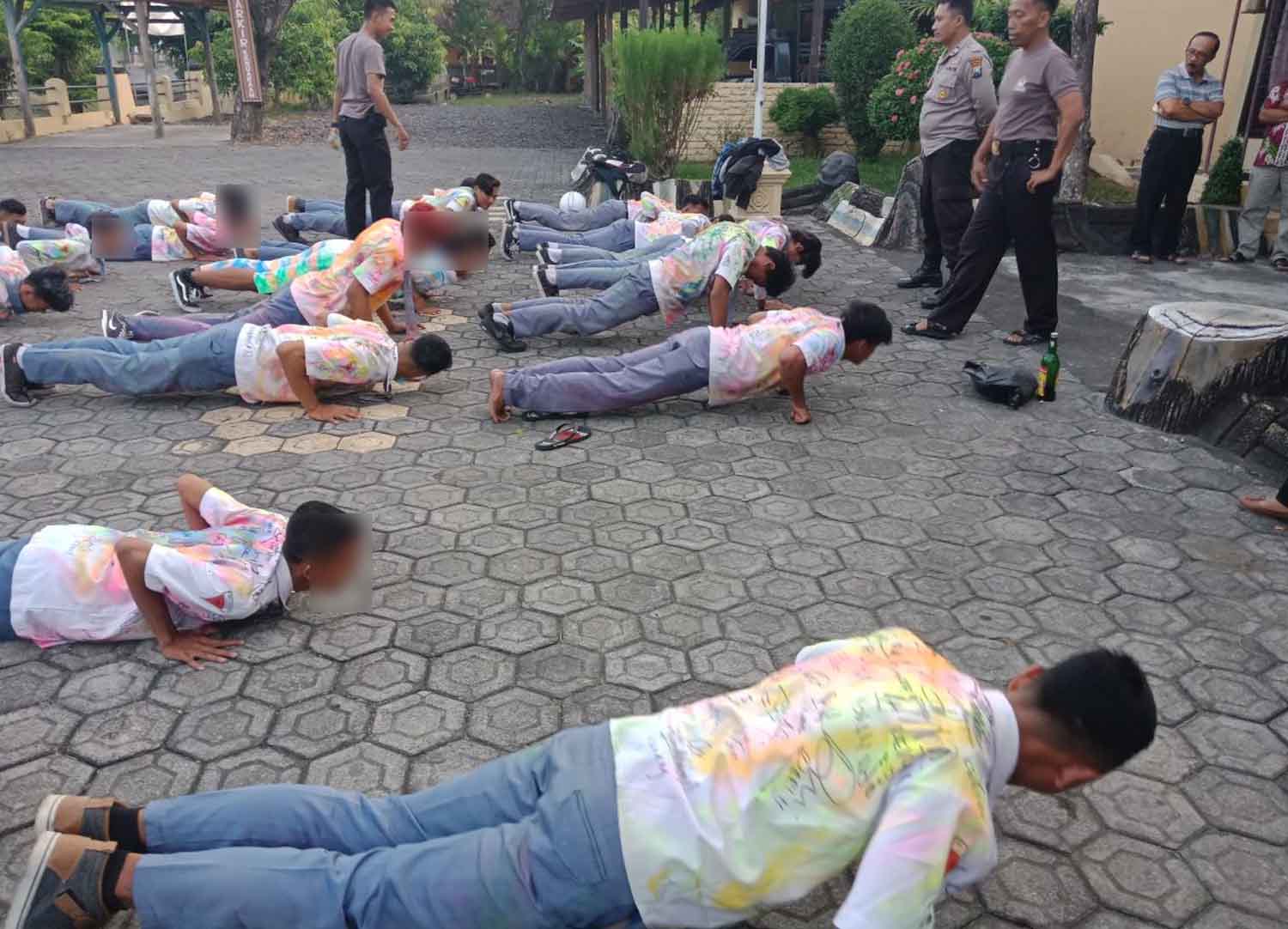 Para pelajar yang terjaring itu mengenakan seragam penuh coretan tersebut diangkut dengan mobil patroli ke Mapolsek Tegaldlimo. Setelah didata, mereka diberikan hukuman push up.