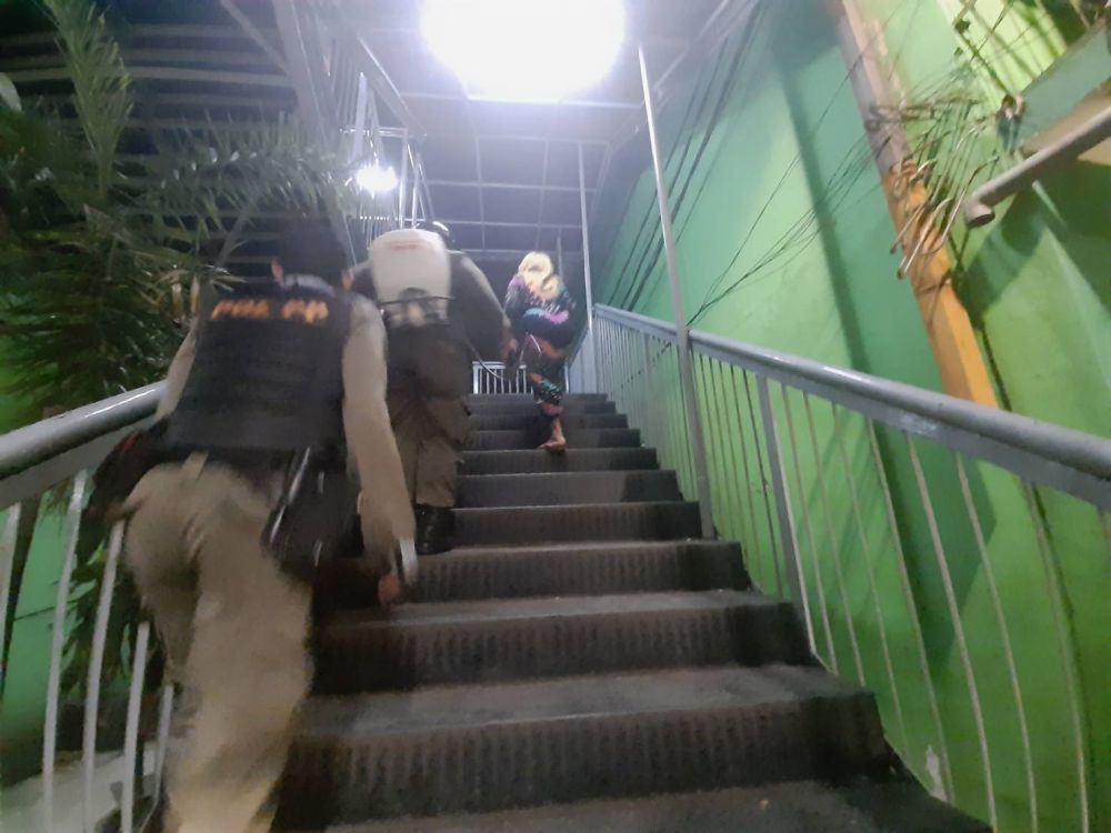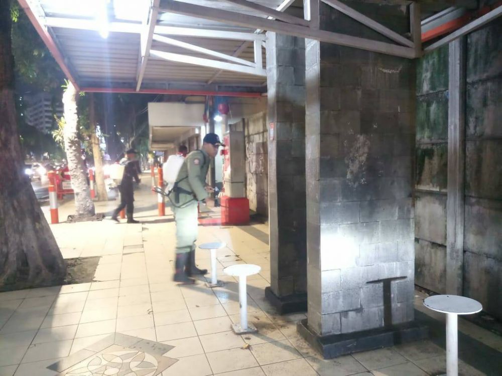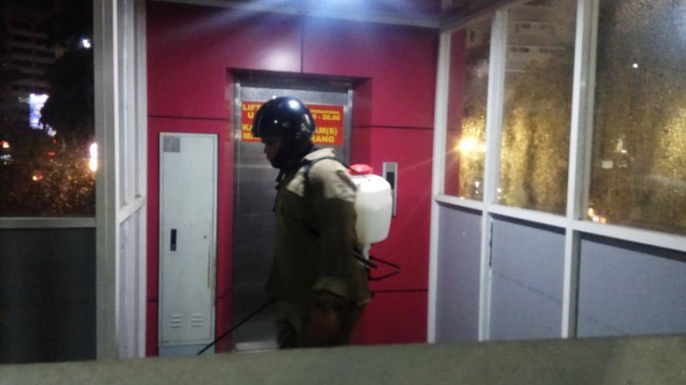 Dua tim dikerahkan melakukan penyemprotan disinfektan di jembatan penyeberangan orang dan lift pada Rabu (18/3/2020) malam.