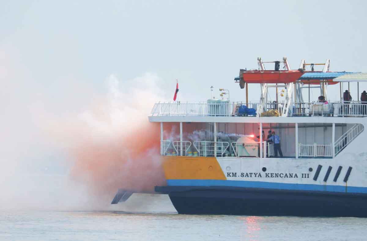 Dalam simulasi yang digelar di dekat Dermaga Ujung, Tanjung Perak Surabaya tersebut, penumpang dibuat seolah-olah panik. Beberapa diantaranya terjun ke laut.