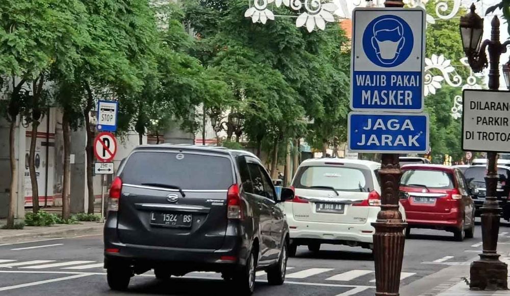 Rambu wajib pakai masker dan jaga jarak terpasang di Jalan Tunjungan Surabaya