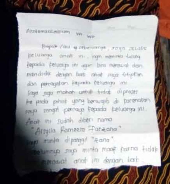 Ini tulisan surat pada secarik kertas yang ada bersama bayi itu: