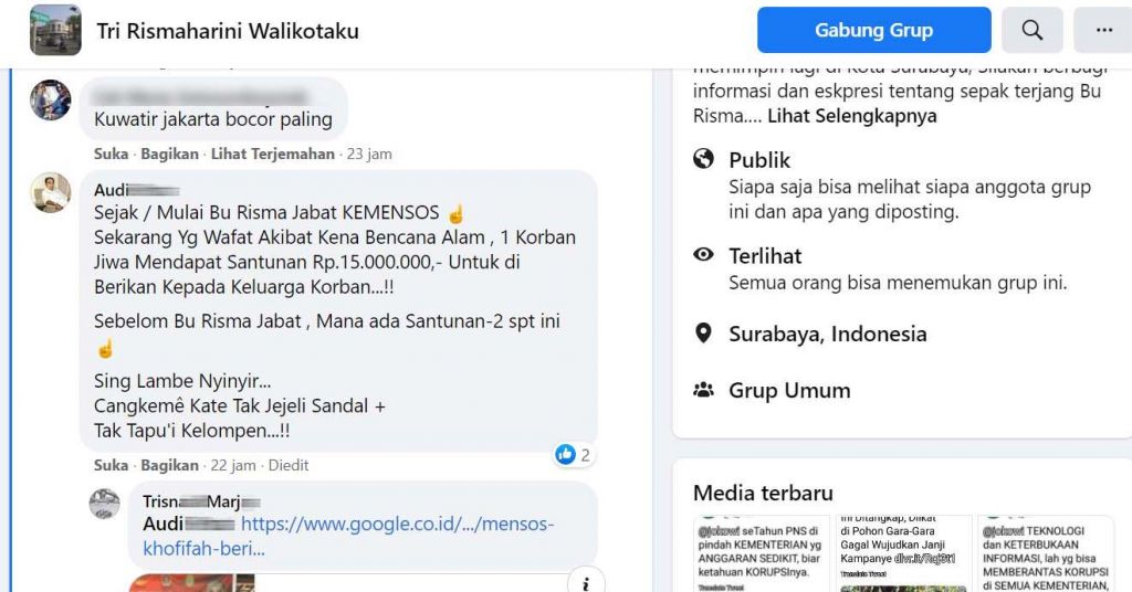 "Seng ngomong lak Mensos e cmn nag Jakarta ae...kiro2 engkok ngomong opo mneh Yo?" tulisnya di Grup Facebook 'Tri Rismaharini Walikotaku' pada pukul 20.51 Wib, 15 Januari.